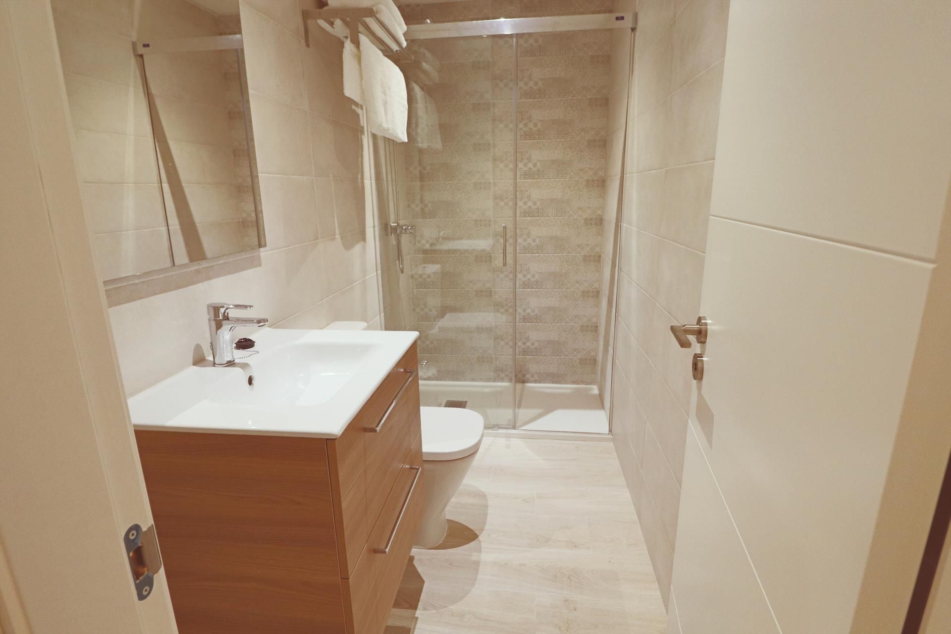 El pasillo conduce a la parte trasera del apartamento. El primero a la izquierda es un baño de calidad con ducha a ras de suelo. Luego, al lado del baño, se encuentra la habitación principal, decorada con buen gusto para brindar una sensación de relajación. Hay una cama doble con mesa auxiliar y lámparas y un gran armario empotrado.