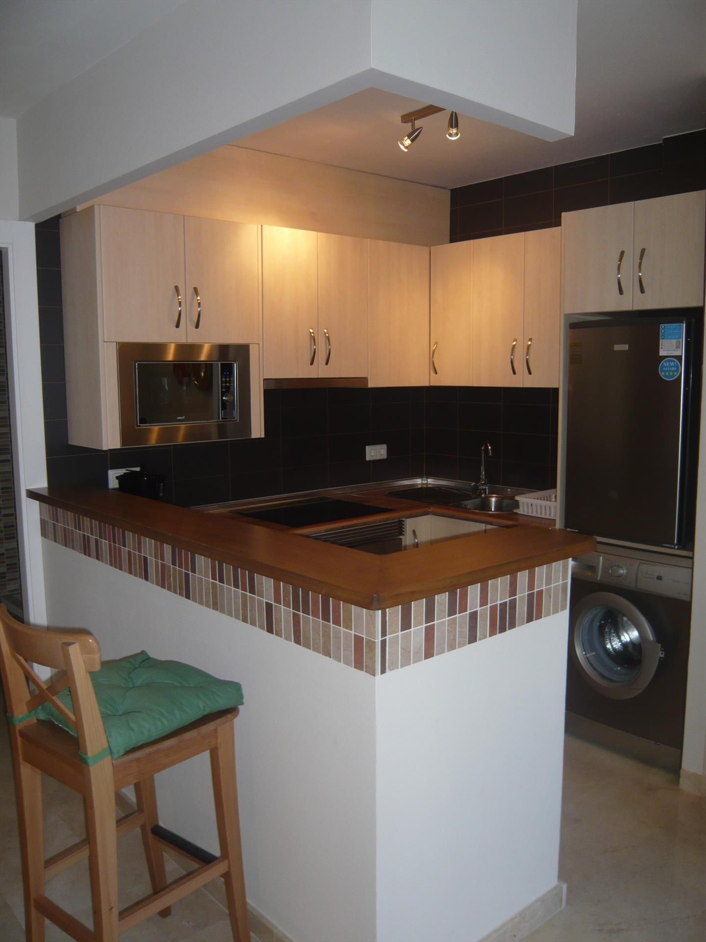 The kitchen is totally fitted out with all utensils and appliances.