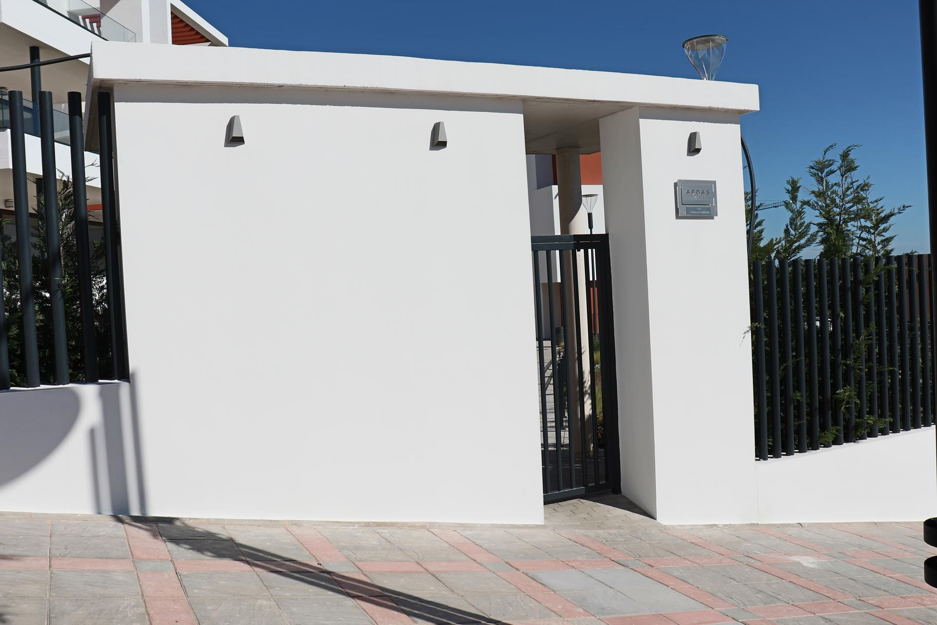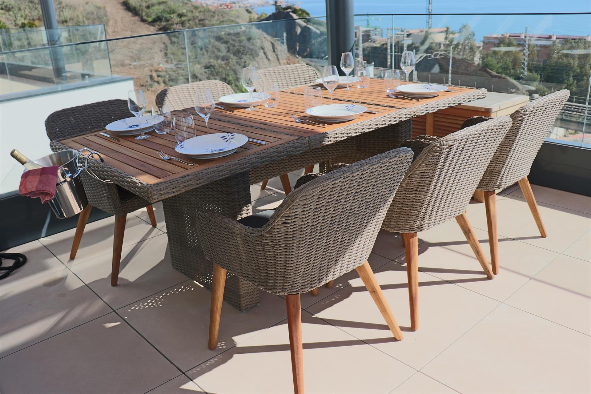 If the weather does not permit eating outside, there is also a sizable dining table that can accommodate six people. There is a fully furnished, top-notch kitchen with an induction stove, oven, dishwasher, and a laundry room with a washing machine, dryer, iron, and other appliances. The apartment features two bathrooms and three bedrooms, all of which have views of the Mediterranean.